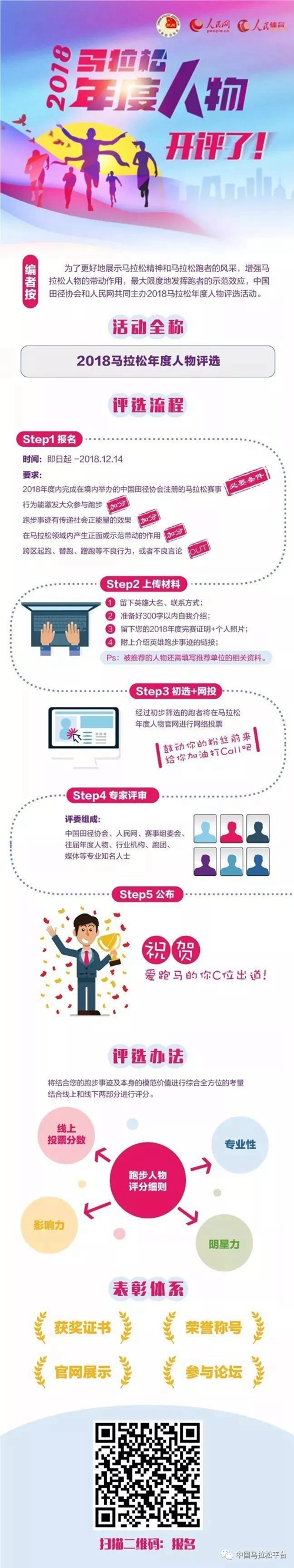 為了更好地傳播馬拉松精神、展現(xiàn)馬拉松跑者的風(fēng)采,最大限度地發(fā)揮跑者的示范效應(yīng),中國(guó)田徑協(xié)會(huì)和人民網(wǎng)共同主辦2018馬拉松年度人物評(píng)選活動(dòng),活動(dòng)由人民體育承辦。