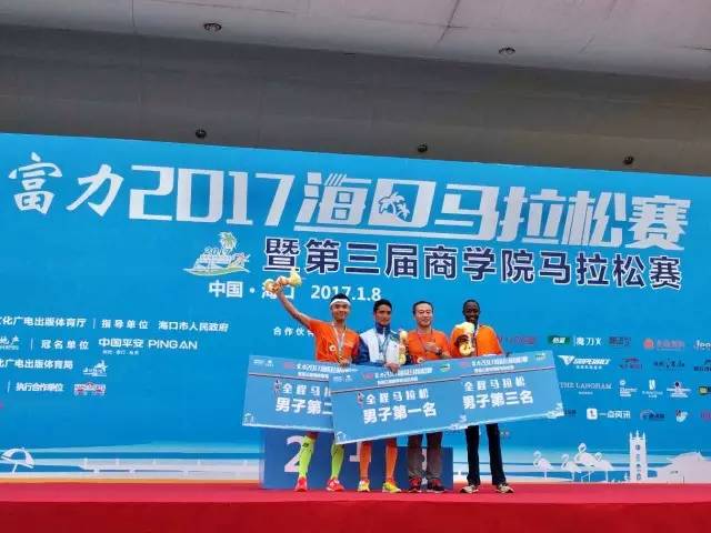 富力地產(chǎn)集團副總裁兼海南區(qū)域公司董事長趙沨先生為2017平安·富力??隈R拉松男子全程前三頒獎